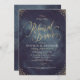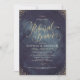 Caligrafia com letras douradas de glamour Ensaio de design de Janto e pontos dourados confetti sobre fundo azul escuro marinho azul céu noturno aquarela, falso efeito metálico de brilho dourado, moderno, chico, elegante e elegante, perfeito para casamento vintage ou casamento no inverno à noite. Personalize seu próprio cartão de convite para casamento. Veja todas as peças correspondentes na coleção abaixo.