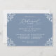 Estes elegantes convites de janto de ensaio de casamento azul são perfeitos para um tema de casamento clássico e sofisticado. O design apresenta um quadro de ornamentado vintage emparelhado com caligrafia elegante e texto clássico. O verso tem as iniciais do casal junto com um hospedado por linha para honrar os hosts do janto de ensaio (isso pode ser excluído se você não quiser).