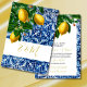 Limões em fundo azul e branco de azulejo no Mediterrâneo da Toscana. As informações são facilmente alteradas para seu próprio convite personalizado. Limão e cor azul.