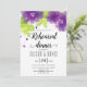 Buquê maravilhoso com flores violetas etéreas roxas e roteiro cursivo caligrafia manuscrita caligrafia floral convite para janto de ensaio de natação da primavera. A parte superior é coberta por um bonito buquê de flores delicadas violetas com folhas verdes.