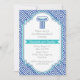 Convite de janto de ensaio de casamento da chave grega azul e coluna. Uma chave na moda grega ou um trasto grego ou um padrão meander design em azul, aqua e branco, uma coluna grega azul e turquesa e o texto da cinza em um quadro com um banner aqua. Moderno, mas com vintage, parece de certo modo. Este elegante com elementos clássicos da antiga design de Grécia é um modelo completamente personalizável e faz parte de um conjunto de casamento perfeito para um Geek de verão de destino ou casamento grego.