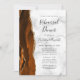 A borda esquerda deste elegante convite para ensaio de casamento moderno apresenta uma borda de cor laranja queimada, aparada com brilho dourado. O texto personalizável combina o script de escrita manual preto com fontes em itálico e em copperplate em uma cinza e fundo de mármore branco. O verso apresenta uma design de cor laranja queimada e dourada.