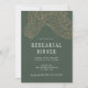 Um cartão de modelo de convite jante para ensaios moderno e elegante, que inclui um verde tropical de folhas de bananas desenhado à mão com dourado. As linhas das palmeiras estão em uma falsa lamúria de ouro. O fundo é verde. Personalize este produto adicionando as suas próprias informações de casamento. Excelente para o casamento de destino ou praia no verão.