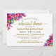 Este belo convite de janto de ensaio é simples, mas colorido e elegante. Apresenta um guião dourado com letras de flores tropicais vibrantes e antigas em tons de rosa-quente, magenta, fuchsia e roxo nos cantos. Ele tem informações sobre o ensaio de casamento, assim como sobre o janto comemorativo que se segue. Perfeito por manter a noiva informada sobre todas as festividades pré-casamento.