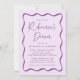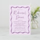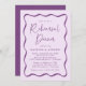 Convide convidados para o seu janto de ensaio em estilo com os nossos convites para janto de ensaio de casamento do Modern Purple Wavy Frame. A design apresenta as palavras "Janto de ensaio" apresentadas num guião roxo manuscrito em contraste com um fundo roxo claro. Os detalhes do seu janto de ensaio estão cercados por uma borda ondulada roxa. Este convite à janta de ensaios retrorreflectores é perfeito para usar em jantadas de ensaio casuais e modernas.