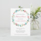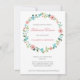Um brilhante e colorido convite de janto de ensaio de casamento é perfeito para o primavera ou estação de verão. Ele apresenta uma coroa floral estilo boho em cores rosa, azul e verde. Seu texto personalizado no centro está em cinza suave e corresponde a cor-de-rosa rosa. O texto adicional está na cinza correspondente abaixo da imagem da coroa. A imagem e o texto são colocados sobre um fundo branco. A parte de trás do convite é azul consistente, adicionando um belo salto de cor.