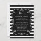 Um convite de janto de ensaio de casamento na moda moderno feito em um padrão listrado branco e preto horizontal. Uma área de texto decorativo preto tem um monograma personalizado e campos de texto prontos para personalização. Um convite encantador que o casal vai acalmar com todas as suas memórias de casamento. Escolha seu estoque de cartão favorito e sua forma de convite.