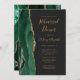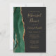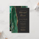 A borda esquerda deste elegante e moderno convite para o ensaio de casamento apresenta uma esmeralda verde aquarela agate borda com falsa brilho dourado. O texto personalizável combina manuscrito dourado, fontes em copperplate e itálico em um fundo fora de preto. O verso apresenta um design emerald verde e dourado.