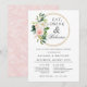 Um convite de janto de ensaio único para dar o tom para a sua celebração de casamento, este design convida os seus convidados a "Comer, Beber e ensaiar". Um quadro circular de anel duplo acentua o título do convite e é embelezado com um buquê floral de cor-de-água, rosas brancas e cor-de-rosa-pincel, com vegetação rasteira. O modelo de texto inclui espaço para os nomes da noiva e do noivo e os detalhes do tempo e do local do ensaio, bem como o tempo e o local do janto.