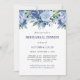 Um belo convite de janto de ensaio de casamento com uma luxuosa borda floral de cor d'água em tons de azul marinho, azul empoeirado e cinza azul. O texto está em fontes marinho azul e preto do serif. O reverso é uma sombra de marinho correspondente.