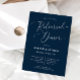 Mínimo convite de janto de ensaio de casamento com a letra moderna do roteiro num fundo azul marinho. Este modelo já tem textos que contêm todas as informações necessárias para o seu evento. Os textos são facilmente personalizáveis on-line.