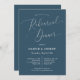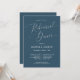 Mínimo convite de janto de ensaio de casamento com a letra moderna do roteiro num fundo teal. Este modelo já tem textos que contêm todas as informações necessárias para o seu evento. Os textos são facilmente personalizáveis on-line.