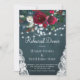 Ensaios elegantes de casamentos no inverno russos jantam modelo de convite para na moda de um quadro azul escuro de meia-noite com uma bela burgundy vermelha escura e peões brancos buquês com folhagem verde de caçador, cordas de luzes brilhantes brancas, cantos de rendas e um roteiro de tipografia quic. +++++++++++++++ Fácil de personalizar com seus detalhes! ++++++++++++++++ O convite é adequado para o elegante país rústico de inverno / fazenda / casota / janto de ensaio de Natal / festas de casal.