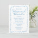 Ponha o tom para uma alegre comemoração pré-casamento com este convite de janto brilhante, divertido e facilmente personalizável de ensaio de casamento azul! Projetado para capturar a magia de sua história de amor, este charmoso modelo apresenta uma estrutura de aquarela ilustrada manualmente em tons azuis suaves, criando uma atmosfera encantadora para eventos de primavera, verão ou inverno. O divertido roteiro do "Janto de ensaio" adiciona um toque encantador, fazer seu convite tão exclusivo quanto seu dia especial. Por que você vai adorar este Janto de ensaio Convite: - Estimicamente Impressionante - Um design artístico sonhador que irradie alegria e elegância. - Totalmente personalizável - Personalize o texto, as fontes e as cores para corresponder ao seu tema de casamento. - Conveniente Código QR de RSVP - O lado traseiro inclui um código QR verificável para respostas fáceis de convidado. - Duas opções de pedidos - Escolha um convite impresso profissionalmente ou um download digital instantâneo e econômico. Perfeito para casais que querem um toque divertido, mas sofisticado, este convite é feito para que seu janto de ensaio se sinta realmente especial. Personalize o seu hoje e deixe a celebração começar!