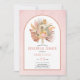 Convite jantado para o ensaio de casamento em arco rosado macio com palmeiras secas tropicais, erva-pampas e flores proteicas. Um quadro de arco em moles quadros de fundo cor-de-rosa e cor-de-rosa, esta adorável design de casamento. Um buquê de aquarela de palmeiras secas, flores de proteína e erva-pampas aparece no quadro.