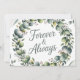 Um delicado cartão de saudação de casamento, com uma lindamente detalhada coroa d'água, Eucalyptus wreath, em tons de verde-menta e verde-sábio, cercando um sutil e texturado fundo branco. A coroa incorpora porcas espalhadas da respiração do bebê e minúsculos sotaques semelhantes a pérolas, criando uma sensação elegante e ligeiramente rústica, com um brilho suave melhorando o efeito da aquarela. No centro da coroa, o texto "FOREVER & SEMPRE" é exibido em uma fonte fluente e moderna em uma cinza prateada macia, complementando os tons naturais e evocando uma sensação de romance eterno. O interior do cartão proporciona um amplo espaço para uma mensagem sentida e incorpora uma ilustração simplificada do eucalipto sprig no canto inferior, mantendo o tom sereno e comemorativo.