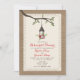 Um convite para o ensaio de casamento, com uma ilustração de uma lanterna cheia de flores vermelhas e azuis penduradas num ramo de árvore com folhas verdes. O fundo na frente e atrás é inspirado em burlap. O recurso principal inspirou o design. Personalize o texto com suas informações.