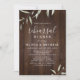 Folhas botânicas de cor aquática modernas sobre fundo de madeira de casca escura, com roteiro e texto modernos, cartões de janto simples e elegantes para o casamento botânico no outono e no inverno. Veja todas as peças correspondentes na coleção.