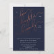 Este belo e moderno Janto de Ensaios de Manchas Azuis, Brancas e Copper, apresenta um falso roteiro de caligrafia em cobre que lê 'To Love, Laughter, and Felily Ever After' como o principal elemento design, sobre um fundo azul marinho. A design é lindamente complementada pela fonte moderna de sans serif de todos os bonés, detalhando o tempo, a data e a localização do janto de ensaio. A parte de trás do convite de janto apresenta uma textura falsa de mármore Carrera para completar o visual chic e sofisticado.