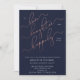 Este belo e moderno Marinho Azul, Rosa Dourado Script e Janto de ensaio de mármore apresenta um falso roteiro de caligrafia em ouro rosa com a leitura 'To Love, Laughter, and Felily Ever After' como o principal elemento design, num fundo azul marinho. A design é lindamente complementada pela fonte moderna de sans serif de todos os bonés, detalhando o tempo, a data e a localização do janto de ensaio. A parte de trás do convite de janto apresenta uma textura falsa de mármore Carrera para completar o visual chic e sofisticado.