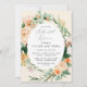 Lindos convites de janto de ensaio com um elegante tom pastel neutro e neutro molhado em moldes florais botânicos em tons suaves de pêssego, laranja, pincel suave, amarelos e muitos tons de verde de sábio verde a verdes brilhantes e profundos. Seus detalhes personalizados são exibidos em um elevado layout tipográfico que coloca o convidado de honra em frente e no centro.