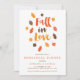 Um janto de ensaio tipográfico perfeito para o outono/outono, com a frase "apaixonar-se" na letra moderna do estilo escrito, com pincel, e a queda de folhas ilustradas em laranja, castanho, amarelo-mostarda/ocre. O convite pode ser totalmente personalizado com os detalhes do evento. O inverso está em cinzas sólidas.