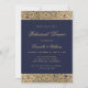 Este elegante convite de janto de ensaio com ar vintage tem bordas de ouro floral de intrincadas decorações de rosas selvagens sobre fundo azul marinho. As palavras "Janto de ensaio" e os nomes da noiva e do noivo e a última frase são escritas em uma escrita caligráfica elegante, o resto em bonés. Todo texto pode ser personalizado e tem uma cor de ouro semelhante às rosas douradas nas bordas. As decorações de rosas de ouro são de um cobrir de livros antigos, de 1912, de As Obras Políticas Completas de Geoffrey Chaucer, agora no dominio público.