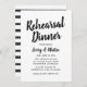 Esses convites mínimos e na moda de janto de ensaio de casamento apresentam um título de script preto escovado e manuscrito e um padrão de faixas horizontais em preto e branco no lado traseiro da carta. O texto personalizado moderno pode ser totalmente personalizado para seu evento especial.