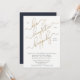 Este belo e moderno Janto de Ensaios de Letras Pretas e Douradas apresenta um falso roteiro de caligrafia em folha de ouro lendo 'To Love, Laughter, and Happy Ever After' como o principal elemento design. O design é belamente complementado pela moderna fonte sans serif de boné em preto, sobre fundo branco e nítido, detalhando o tempo de janto, data e local do ensaio. A parte de trás do convite apresenta uma textura azul-marinho moderna, para completar o visual chic, sofisticado.