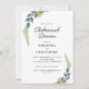 Este convite de janto de ensaio de casamento apresenta gráficos aquarela de verde-claro em verde-claro e verde-oliva brilhante sobre fundo branco.