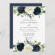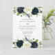 Convite de Festa de noivado com tipo elegante e flores florais de aquarela no topo e no fundo. As cores incluem azul marinho, creme, branco e verde.