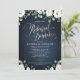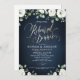 Caligrafia moderna de "janto de ensaio" de ouro falso e caligrafia branca de cor-d-água, verde floral de eucalipto em fundo azul escuro de marinho, elegante e na moda, excelente para o casamento rústico de verde, casamento de jardim botânico, casamento floral de boho no verão e no inverno.