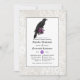 Convite jantado para ensaio de casamento gótico preto e roxo, com um corvo decorado com rosas e um fundo de cadáveres com cor damasco rosa invertida.