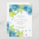 Delicar flores azuis, convite jantado para o ensaio de casamentos florais de primavera, com flores bonitas em tons de azul, aqua, turquesa e azul marinho, folhas em verde e texto em cinza. Esta elegante e moderna design faz parte de um jogo de casamento e é uma modelo perfeita e personalizável para um casamento de primavera ou verão.