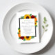Design apresenta girassóis, rosas e flores silvestres elegantes com uma paleta de cores amarelo ouro, vermelho e laranja. Design também apresenta uma estrutura de cinza de carvão. Você pode alterar a cor de fundo na parte frontal e na parte traseira para a cor de sua escolha ou deixar ambas definidas como brancas.