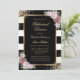 Convite jantado elegante de ensaio em branco e preto, com faixas brancas, com flores cor-de-rosa pinceladas, que enquadra os detalhes do evento em dentro de um quadro dourado adornado com confete dourado. Itens correspondentes disponíveis. Lave o convite para janto de ensaio floral. Convite para janto de ensaio em preto e ouro.