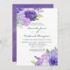 Convite de janto de ensaio de floral de aquarelas com cor do ano 2018 ultravioleta com tons de roxo e verde de sábio. As flores incluem hidrangea, lavanda, peonias e rosas.