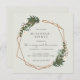 O ensaio de bolos moderno janta convites com os detalhes do seu evento dentro de um quadro geométrico dourado rodeado de verde e flores brancas. Um design botânico perfeito para uma celebração boêmica no verão. Quadro cortesia de:<a href="http://www.freepik.com">Concebida por Freepik</a>