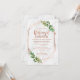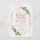 Procurando um convite de casamento para o ensaio de temas modernos e elegantes ou verdes? Este design de luz apresenta uma fonte de caligrafia moderna e uma arte de linha geométrica em um falso rosa de ouro e dois arranjos de folhagem de aquarelas. O fundo é uma imagem de mármore.