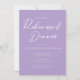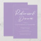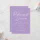 Este belo convite de janto de ensaio lilás apresenta uma bela tipografia branca num fundo púrpura macio para um casamento na primavera. Os convites para pastel de lavanda são uma delicada escolha de cor para uma ocasião elegante de jardim.