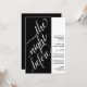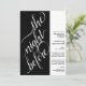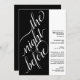 Este belo convite de janto de ensaio de casamento é moderno, simples e elegante. Ele apresenta um design preto e branco de dois painéis com caligrafia elegante na escrita à esquerda, lendo "a noite anterior" e todo o texto informativo para o ensaio de casamento e o janta à direita. O estilo minimalista limpo é ousado e artístico, mantendo ao mesmo tempo um sentimento subestimado.