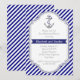 Marinho azul, listras brancas e ancorar convite para janto de ensaio náutico de casamento. Um design de padrão na moda striped com marinho azul, faixas diagonais brancas, uma âncora com um coração e corda azuis e seu texto em um quadro com uma faixa. Moderno, mas com vintage, parece de certo modo. Você pode alterar o plano de fundo e a cor do texto escolhendo entre mais de 200 cores do gráfico de cores do Zazzle. Este design de classe é um modelo completamente personalizável e faz parte de um casamento perfeito para um casamento de verão.