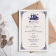 Design de ensaio de náutica elegante em náutica, janto de ensaio de náutica, com uma ilustração vintage caprichosa de um barco com duas aves e um ornamentado floresce. Design apresenta a tipografia serif tradicional e uma faixa de rolagem. Um design lindo e único, perfeito para um casamento de praia náutica! Clique no botão PERSONALIZAR TI para personalizar fontes, mover texto e criar seu próprio design de convite exclusivo.