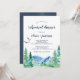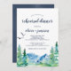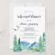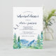 Este convite de janto de ensaio da Montanha Rocky é perfeito para um ensaio de casamento ao ar livre. O design apresenta uma paisagem de natureza selvagem pintada, azul e verde, com pinheiros de aquarela, pássaros e montanhas.