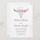 Convide seus convidados de janto de ensaio de casamento em estilo com este convite temático. Este modelo de design apresenta um crânio de vaca boho desenhado à mão com um vestido cor-de-rosa pincelado de cabeça floral de rosas delicadas sobre um fundo de madeira branca e cinza, curvada. Personalize seus detalhes de casamento em um roteiro preto elegante. A parte traseira da placa também tem uma textura falsa de madeira para combinar. Os melhores votos para o seu casamento! Desenhada pela artista Susan Coffey.