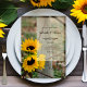 Convide convidados para uma festa de janto pré-casamento casual, mas clássica, honrando a noiva e o noivo com o encantador convite para Janto de ensaio de casamento russo e vagão ocidental. Este janto nupcial personalizado estilo ranch apresenta uma fotografia floral, pintada digitalmente, de flores de girassol amarelas, posto de cerca de madeira rústica e uma velha roda de vagão enferrujada. Inpo perfeito para um evento informal de celebração de um celeiro de fazendas.