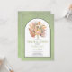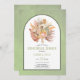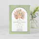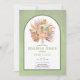 O convite para o ensaio de casamentos com arco verde-sábio janta com palmeiras secas tropicais, erva-pampas e flores proteicas. Um quadro de arco em um sábio, verde, armações de fundo manchadas nesta adorável design de casamento. Um buquê de aquarela de palmeiras secas, flores de proteína e erva-pampas aparece no quadro.