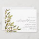 Um convite de janto de ensaio de na moda, que inclui azeitonas pretas de cor aquosa e folhas verdes. "janto de ensaio" está na caligrafia moderna da cinza.