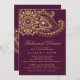 Este cartão de convite de janto de ensaio paisley, de ouro, é perfeito para um ensaio de casamento elegante. O design mehndi apresenta um adorável hena mandala floral e motif paisley em um fundo burgundy. Nota: Este design não apresenta folha de ouro real. É um gráfico de alta qualidade feito para se parecer com folhas de ouro.