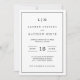 Simples convite de janto de ensaio, com um design moderno, mas elegante, com duas letras de monograma no topo e seus detalhes cercados por uma fina borda. Todo o texto está preto, sobre fundo branco e fundo preto sólido. As fontes e as cores de fundo podem ser alteradas para qualquer cor desejada. Um design chic e na moda que é excelente para um casal minimalista.